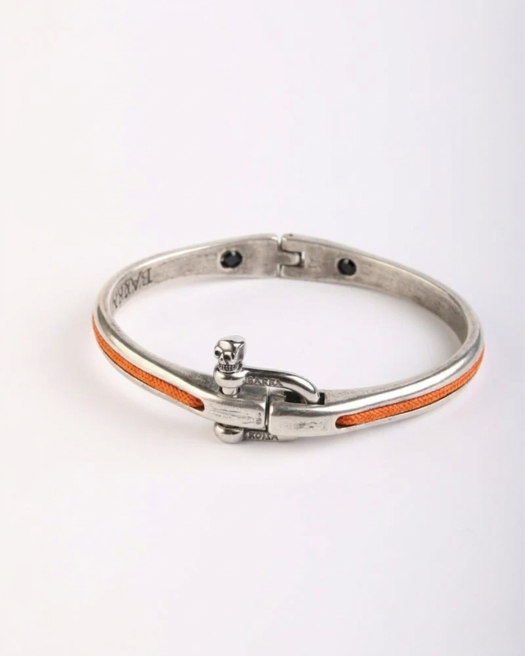 El cierre, un auténtico nautical shackle, está rematado con nuestro icónico pasador en forma de calavera: un sello de identidad Barba-Rossa que desafía lo convencional y rinde homenaje al mar y a quienes se atreven a vivir con intensidad.