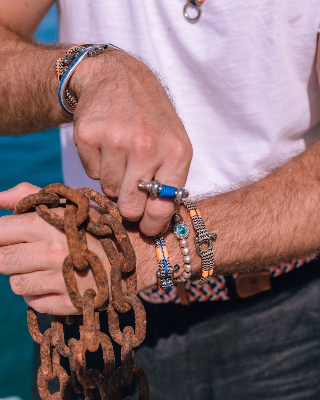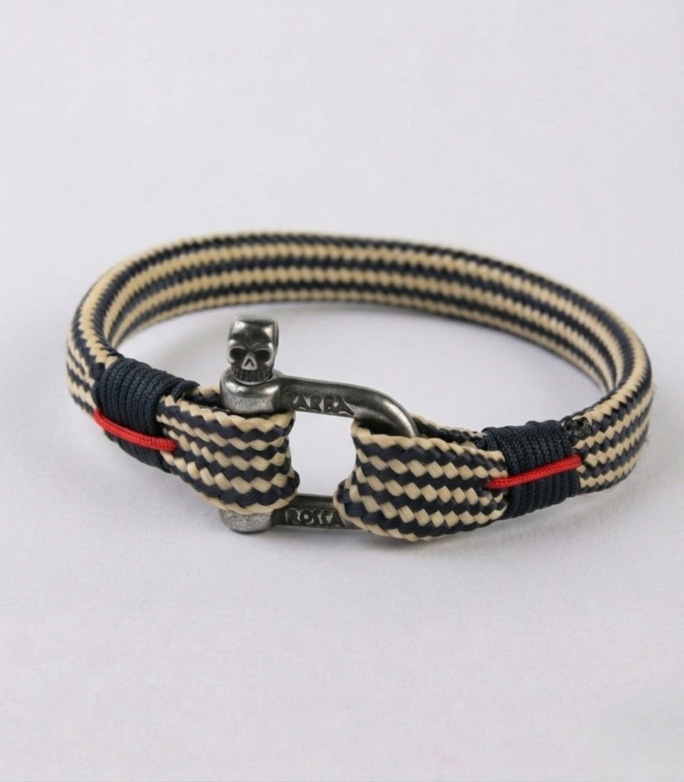 Bracelet nautique fabriqué artisanalement à Minorque en base lineal con los colores navy , beige et rouge, une fusion de style et de résistance. Fabriqué avec un cordage nautique haute ténacité, il garantit durabilité et un ajustement confortable. Son fermoir en manille d’acier inoxydable avec notre crâne Barba-Rossa apporte une touche robuste et sophistiquée, évoquant l’esprit aventurier de la mer. Parfait pour ceux qui recherchent un accessoire polyvalent, résistant à l’eau et au passage du temps. De plus, il dispose d’une garantie de 3 ans, garantissant su qualité et fiabilité .