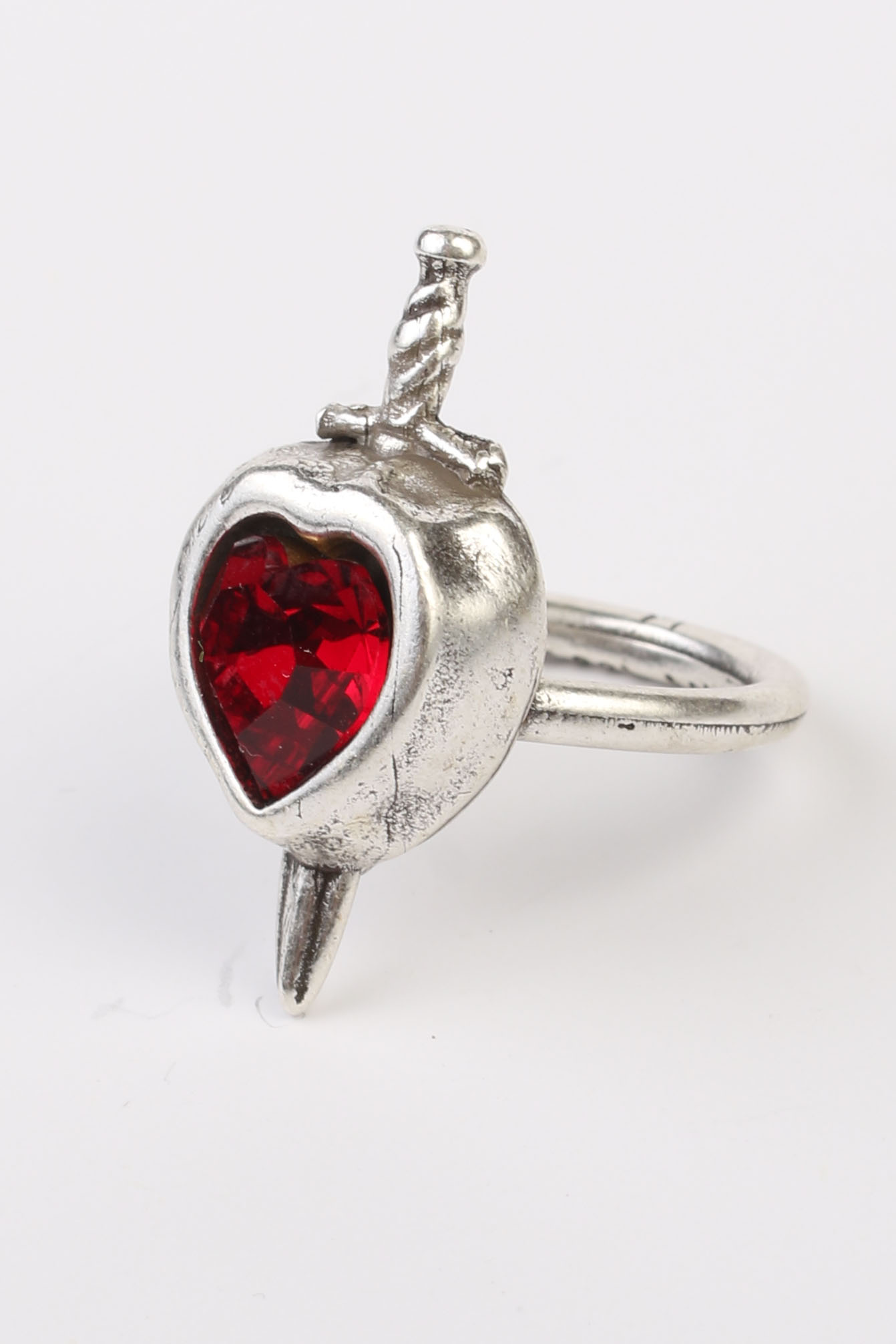 El anillo está acabado en plata, aportando un contraste frío y elegante que realza la fuerza del rojo profundo del corazón. Cada reflejo captura una historia de lealtad, sacrificio y juramentos hechos con el corazón en la mano.
