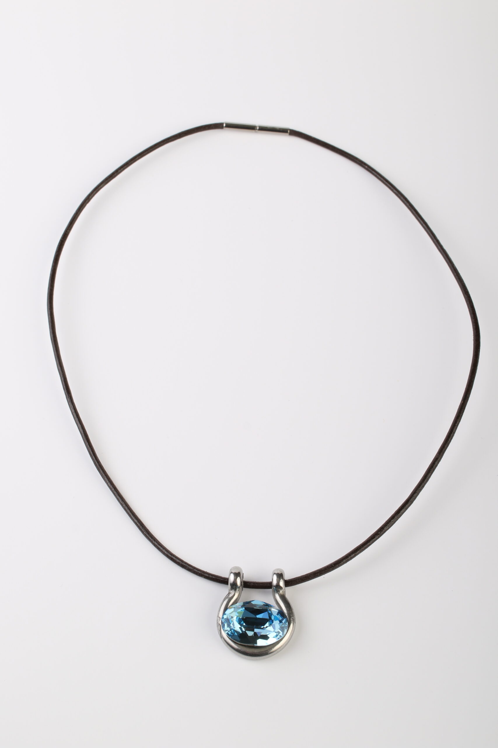 Este colgante combina la fuerza de un grillete con la delicadeza de un cristal Swarovski ovalado, que refleja la luz con un brillo profundo y envolvente.
