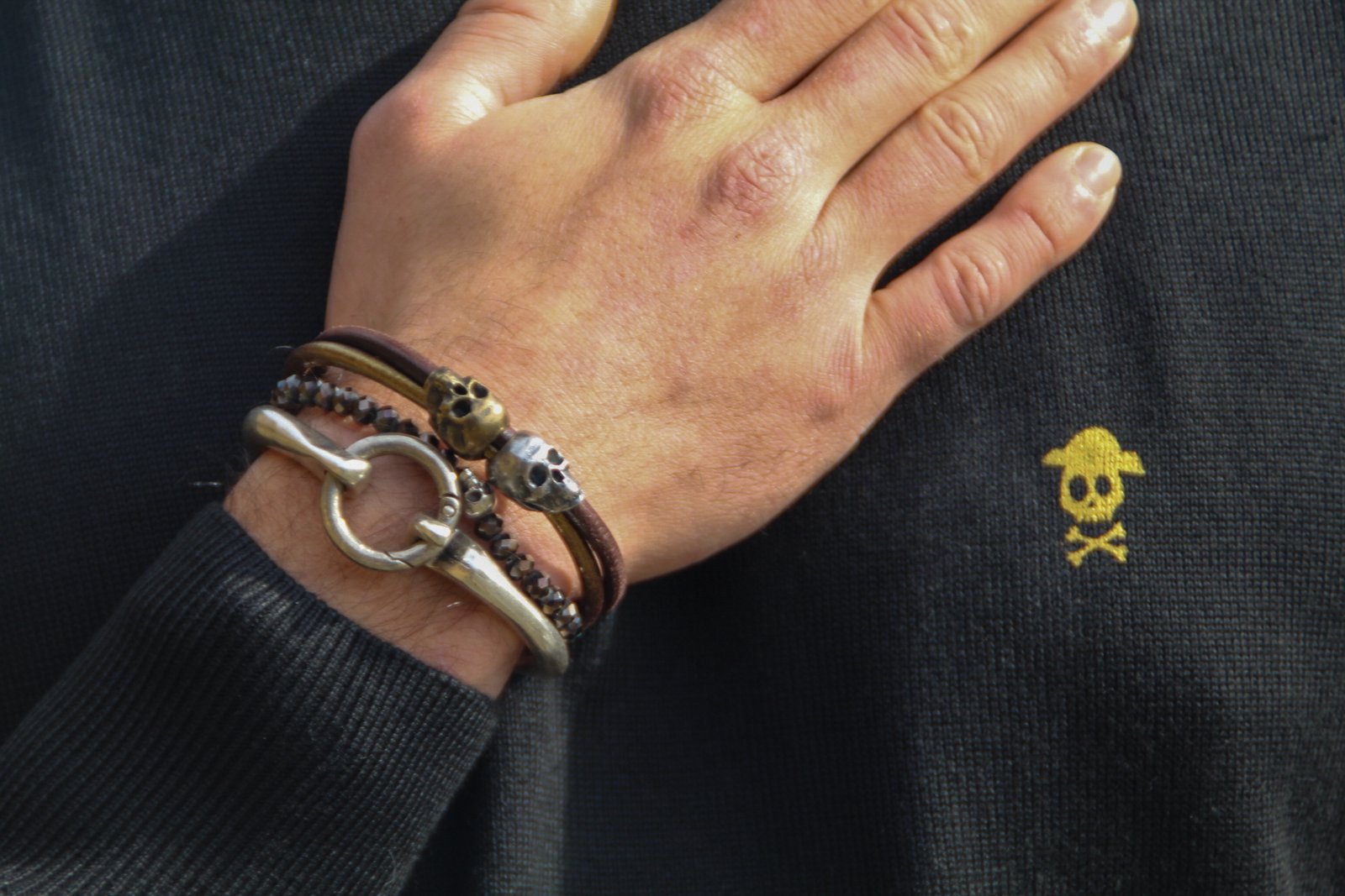 con un colgante de calavera bañada en 0,25 micras de oro viejo,como símbolo de desafío y espíritu indomable.
