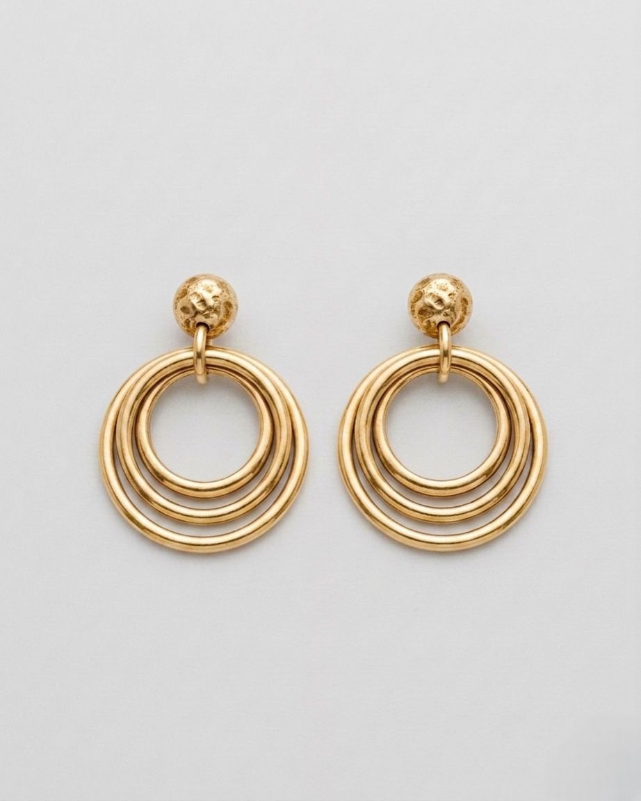 Pendientes colgantes de círculos concéntricos con un movimiento hipnótico que atrapa la luz y la mirada en cada gesto. Su diseño fluido crea un vaivén constante, casi magnético, que aporta vida y dinamismo a quien los lleva.