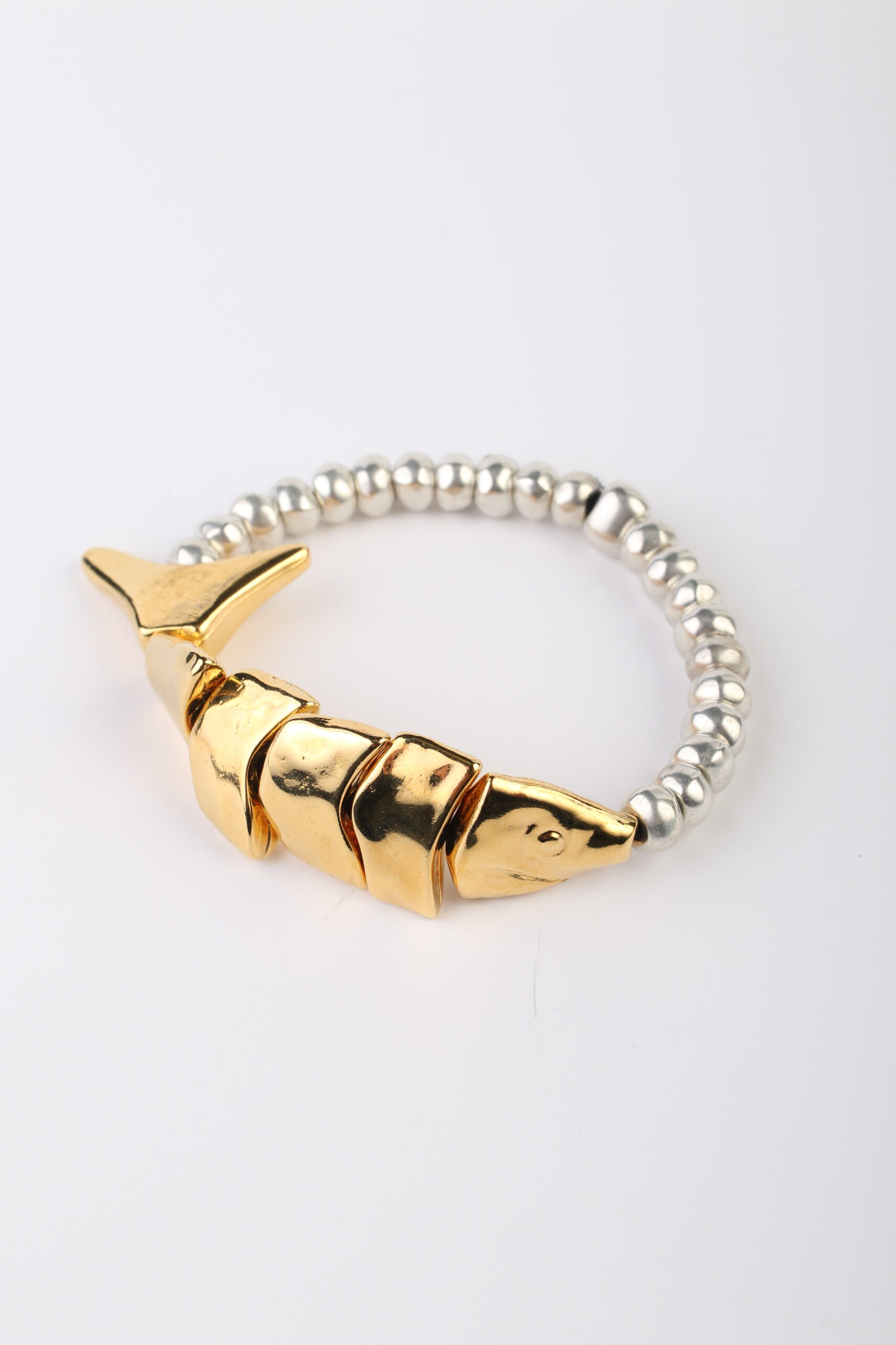 Pequeñas esferas plateadas, como lágrimas saladas atrapadas en un instante. Así se forma Big Fish, una pulsera elástica y delicada, tejida con piezas redondas bañadas en plata y un gran pez artículado bañado en oro que nada entre ellas como un recuerdo que no se quiere soltar.