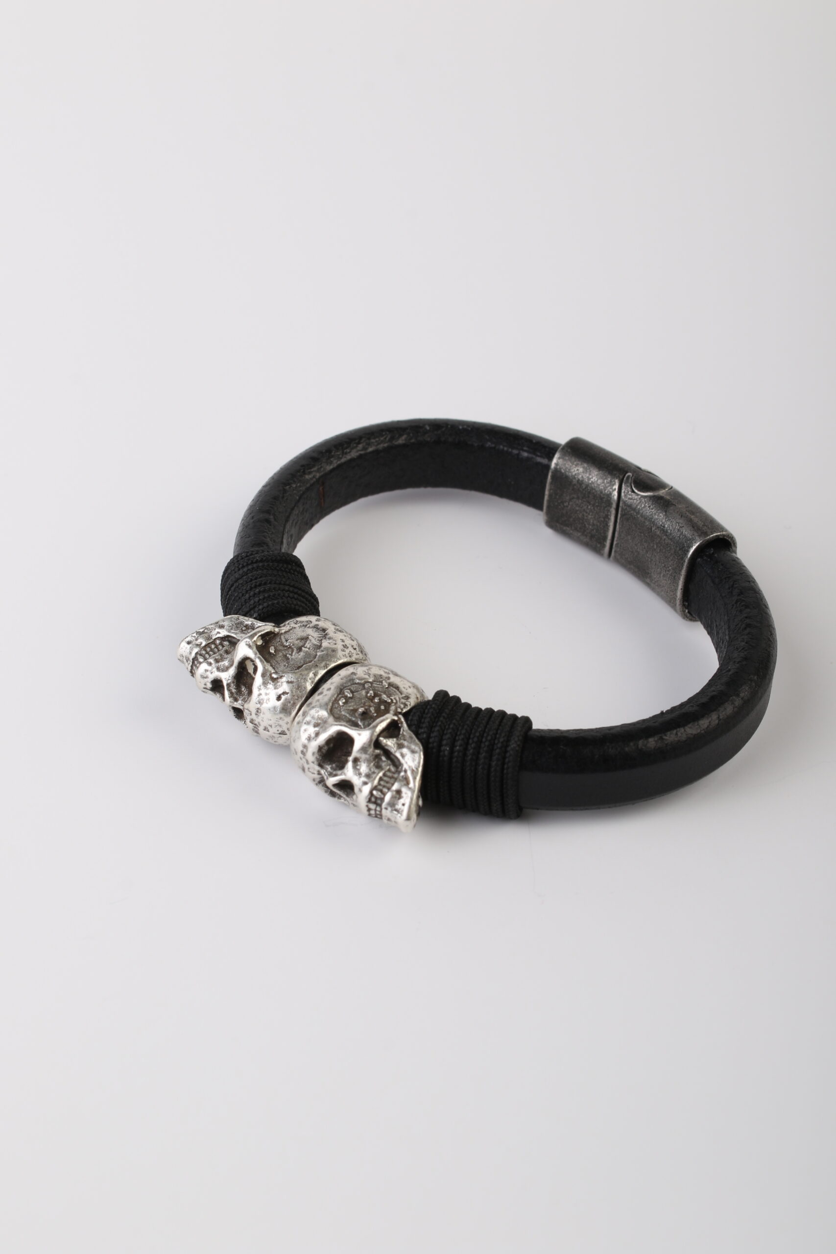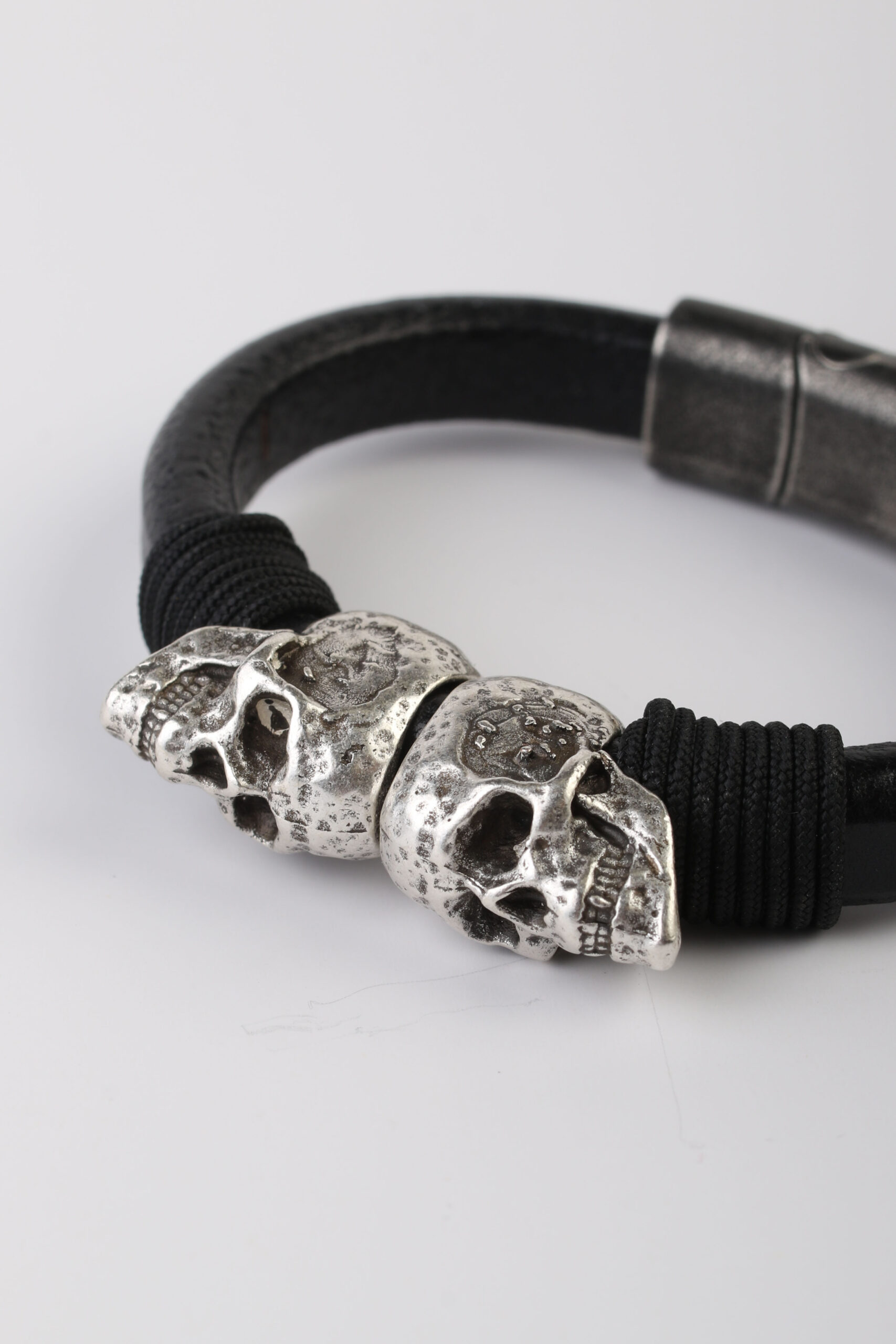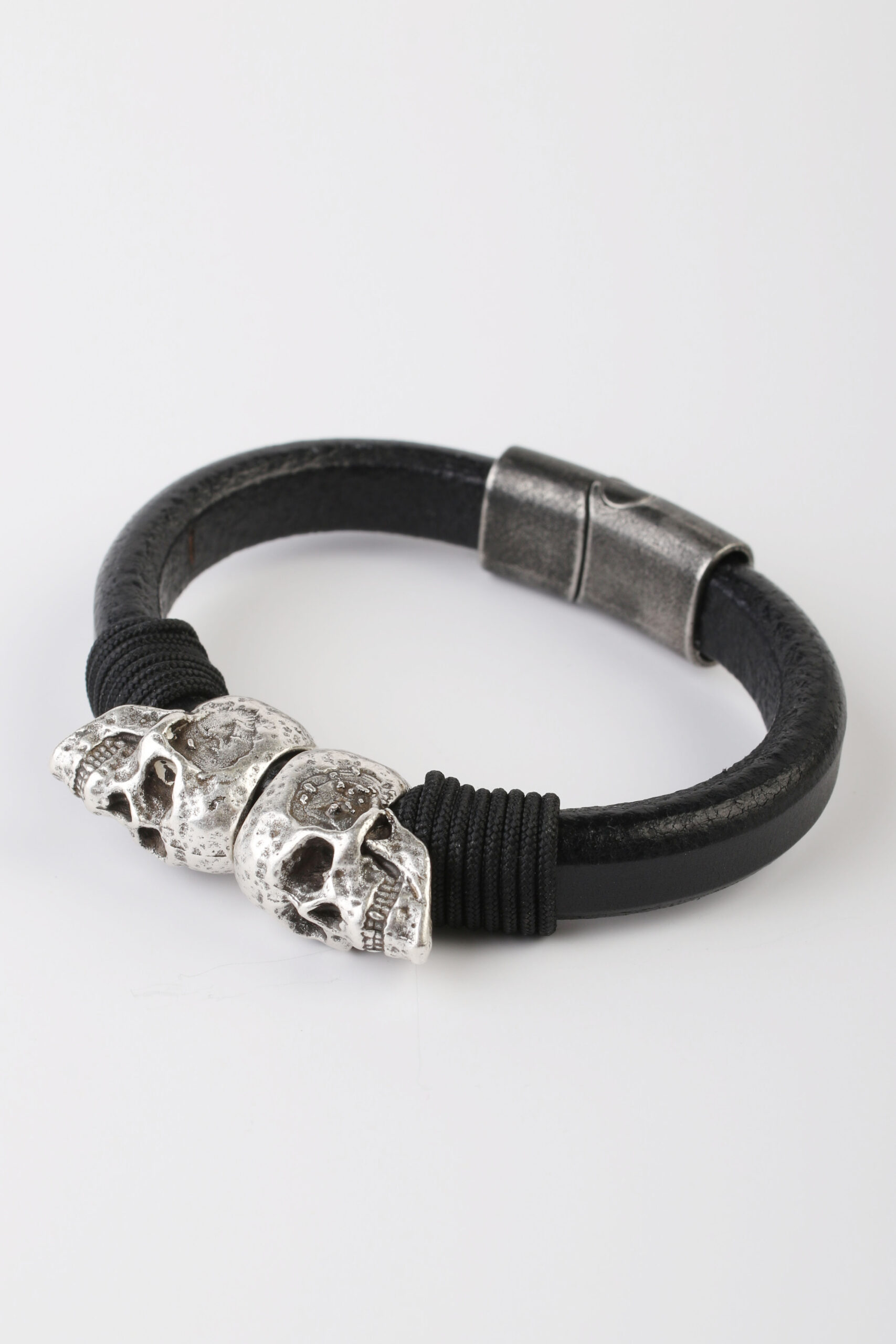 Para aquellos amigos que son hermanos de sangre, unidos por lealtad y aventuras. Esta pulsera de cuero con dos calaveras simboliza la fuerza de esos lazos que duran para siempre.