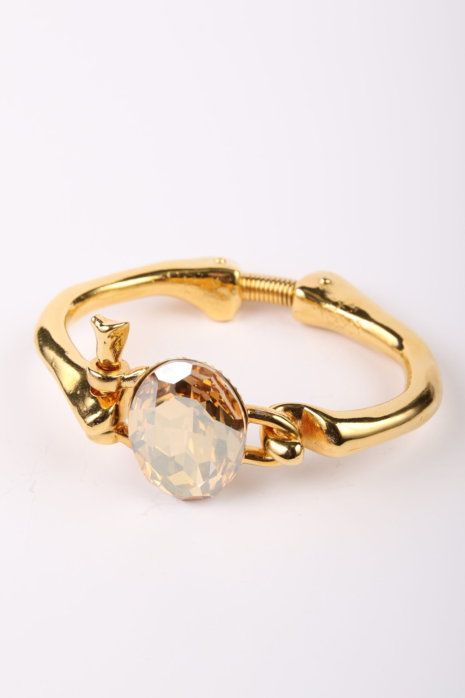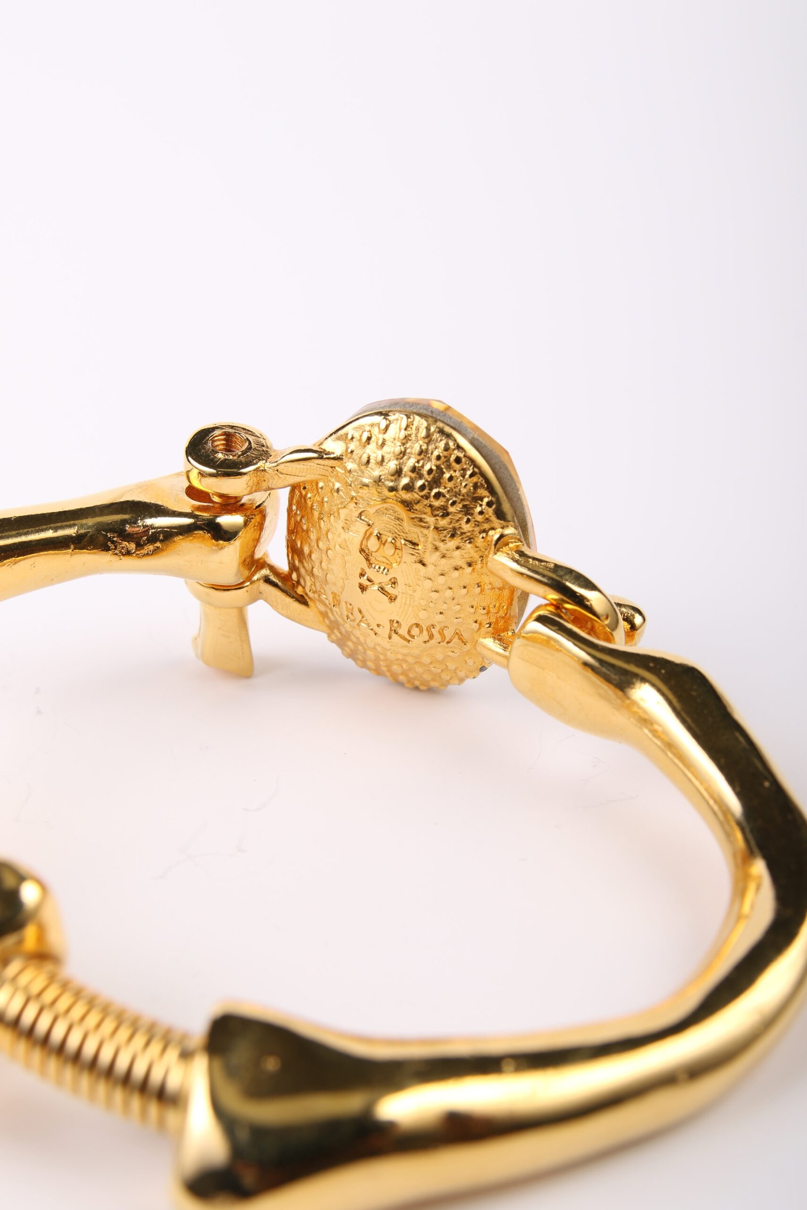 Forjada en el filo entre lo salvaje y lo sublime, la Bone Machine Golden Shadow es una joya de contrastes. Su estructura, moldeada a partir de auténticos huesos, está bañada en oro de 0.25 micras, pero es su cierre lo que la convierte en una pieza única: un cristal Swarovski , profundo y enigmático, que captura la luz con una intensidad casi hipnótica.
